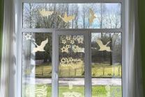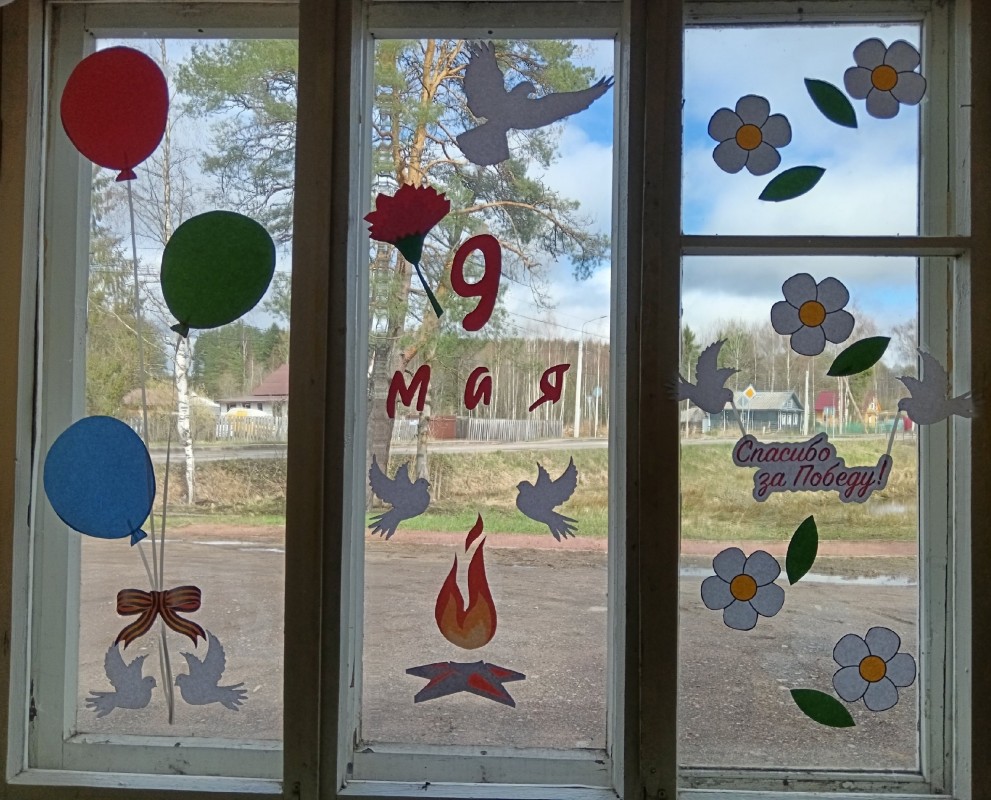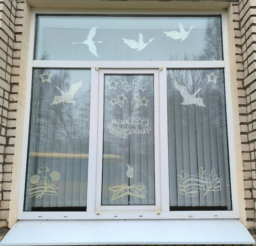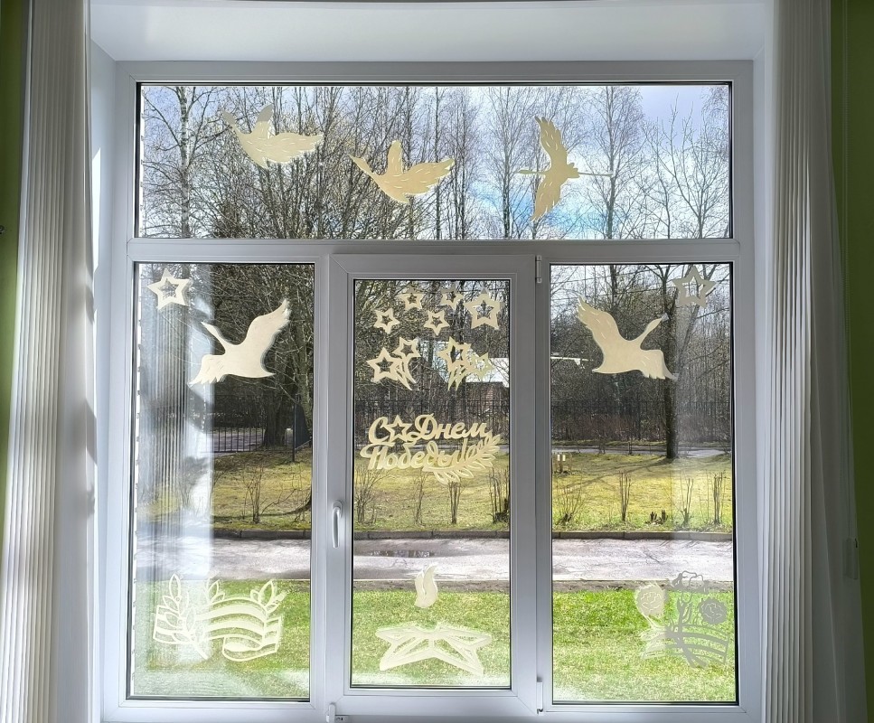 Воспитатели и дети вместе украшали окна групп тематическими вырезанными изображениями и символами Победы. Каждый элемент наполнен глубоким смыслом. На окнах появились изображения цветов, георгиевских лент, вечного огня, голубей мира, журавлей и многих других символов, связанных с Победой.
