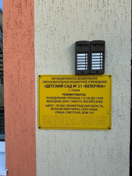 - Имеется наличие при входе в объект вывески с названием организации, графиком работы организации, а также тактильная вывеска с шрифтом Брайля, информирующая слабовидящих и незрячих посетителей о названии организации, времени работы, адресе и контактных телефонах.