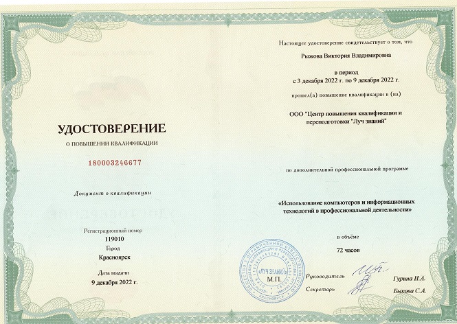 2022 г. Повышение квалификации в ООО «Центр повышения квалификации и переподготовки «Луч знаний» по дополнительной профессиональной программе «Использование компьютеров и информационных технологий в профессиональной деятельности».