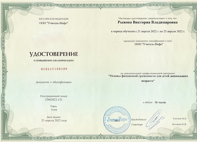 2022 г. Повышение квалификации в ООО «Учитель-Инфо» по дополнительной профессиональной программе «Основы финансовой грамотности для детей дошкольного возраста».