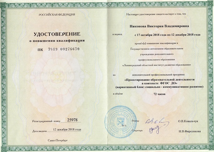 2018 г.– Повышение квалификации в Государственном автономном образовательном учреждении дополнительного профессионального образования «Ленинградский областной институт развития образования» по дополнительной профессиональной программе «Проектирование образовательной деятельности в контексте ФГОС ДО» (вариативный блок: социально-коммуникативное развитие).